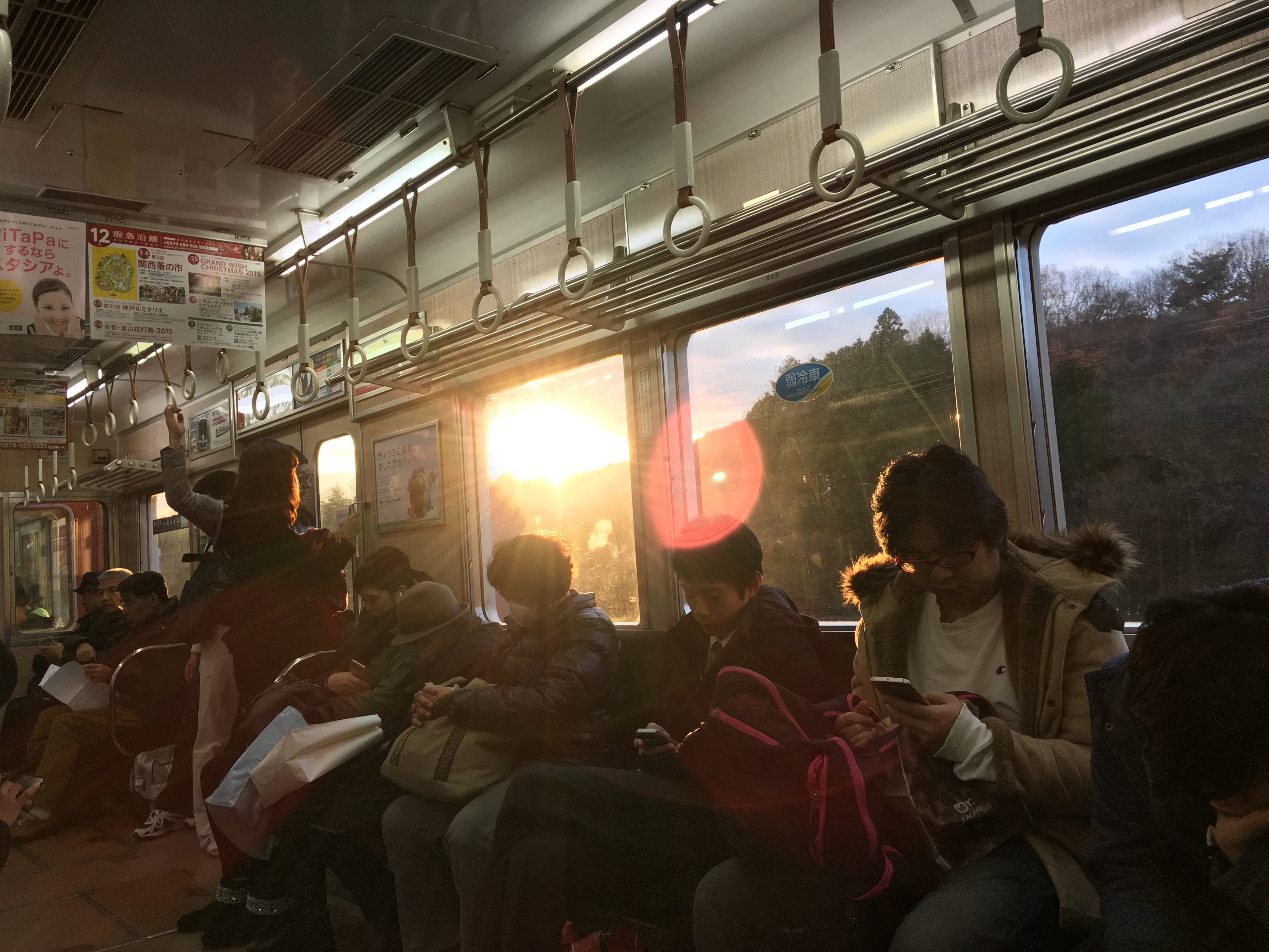 開往有馬溫泉的火車在金色的夕陽中往前駛,列車上的人都在滑手機,沒有人抬頭看窗外的景色,我們的生活被制約在手掌上的螢幕裡,喜怒哀樂,掌中的日子。
