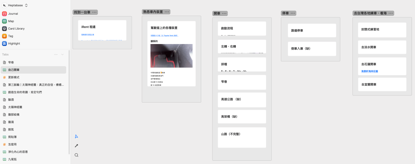 可以慢慢地在家裡,用 Heptabase 整理「自己去開車」的筆記:從怎麼租車、重新整理教練教的各種課程筆記,包含自己在 Youtube 上找的輔助影片、替未來自己去台灣各地練車做些初步計畫…..