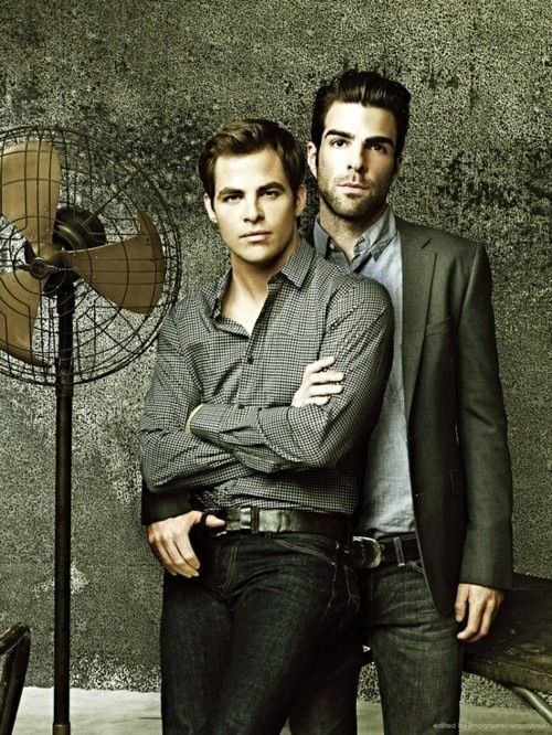 認識這兩個男人是在新版的 Star Trek 電影裡,畢凱艦長與史巴克經典男男團隊組合,其中一人又是已出櫃同志,你看那隻手放在哪裡?