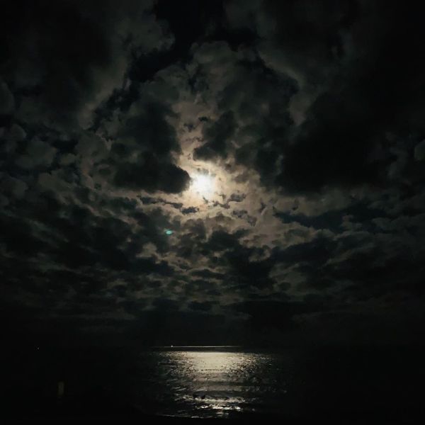 磯崎海岸的海水與月光,在闃黑中流轉,隨著月亮持續攀升,天空中的雲也逐漸消散。我們坐在民宿房間外的陽台,他在追劇,我念清理句,我很安全,海靠近我,空氣濕了,我把我的兩串黑曜岩手珠放在月光下淨化,黑夜的海並不可怕,而且給我力量。